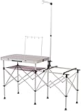 With a pot rack, storage shelf, and stove rest all in one unit, the Coleman Pack-Away Kitchen is way more than just a table. This aluminum cooking station unfolds from a briefcase into a full countertop, with an adjoining rack rest that adjusts to fit most large camp grills. A mesh shelf clips underneath to hold ingredients or dishware, and works as a drying rack to boot. A pot and utensil rack stands ready to hold your culinary tools, while a lamp hook allows you to hang a light source overhead. In fact, if you're anything but a backcountry Mario Batali, you'd better brush up on your cuisine before you break this baby out.Product Features