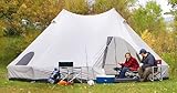 Love the front and back door construction, the roof vents, and the walls that give you way more livable space than a traditional teepee style because they don't slope all the way to floor. WISH this had a rain fly, but I understand the poles wouldn't support that. We have tarp poles and an extra 20x14 tarp to make a rain roof if needed so the tent won't get crushed. Buy the coleman magnetic tent light to stick to a pole because you cannot hang anything from this roof. Wish we had never met another tent. Cannot praise this one enough. The double and triple don't look teepee-ish either with the multiple peaks. Set up camp without straining your marriage and have a fabulous time.